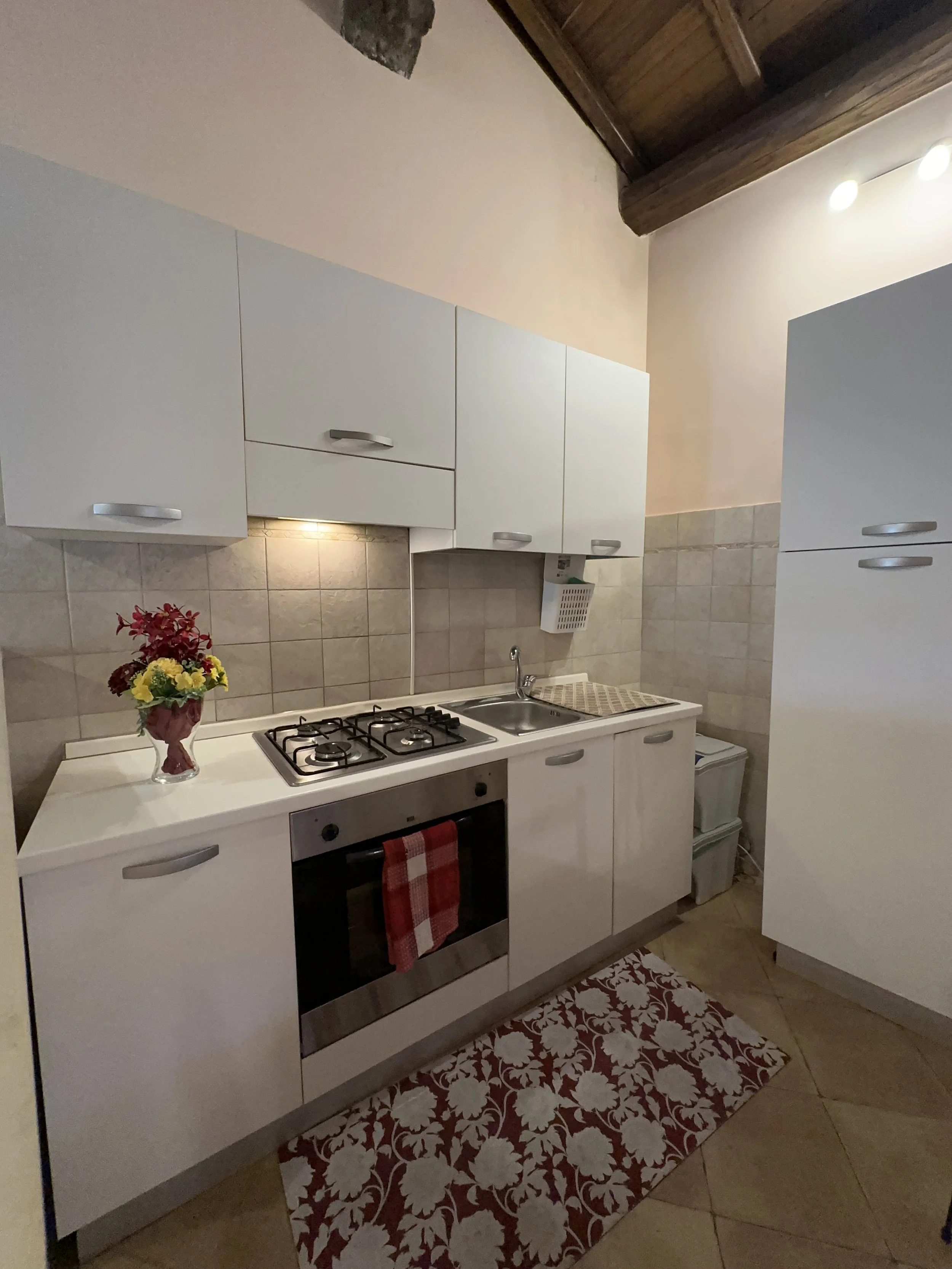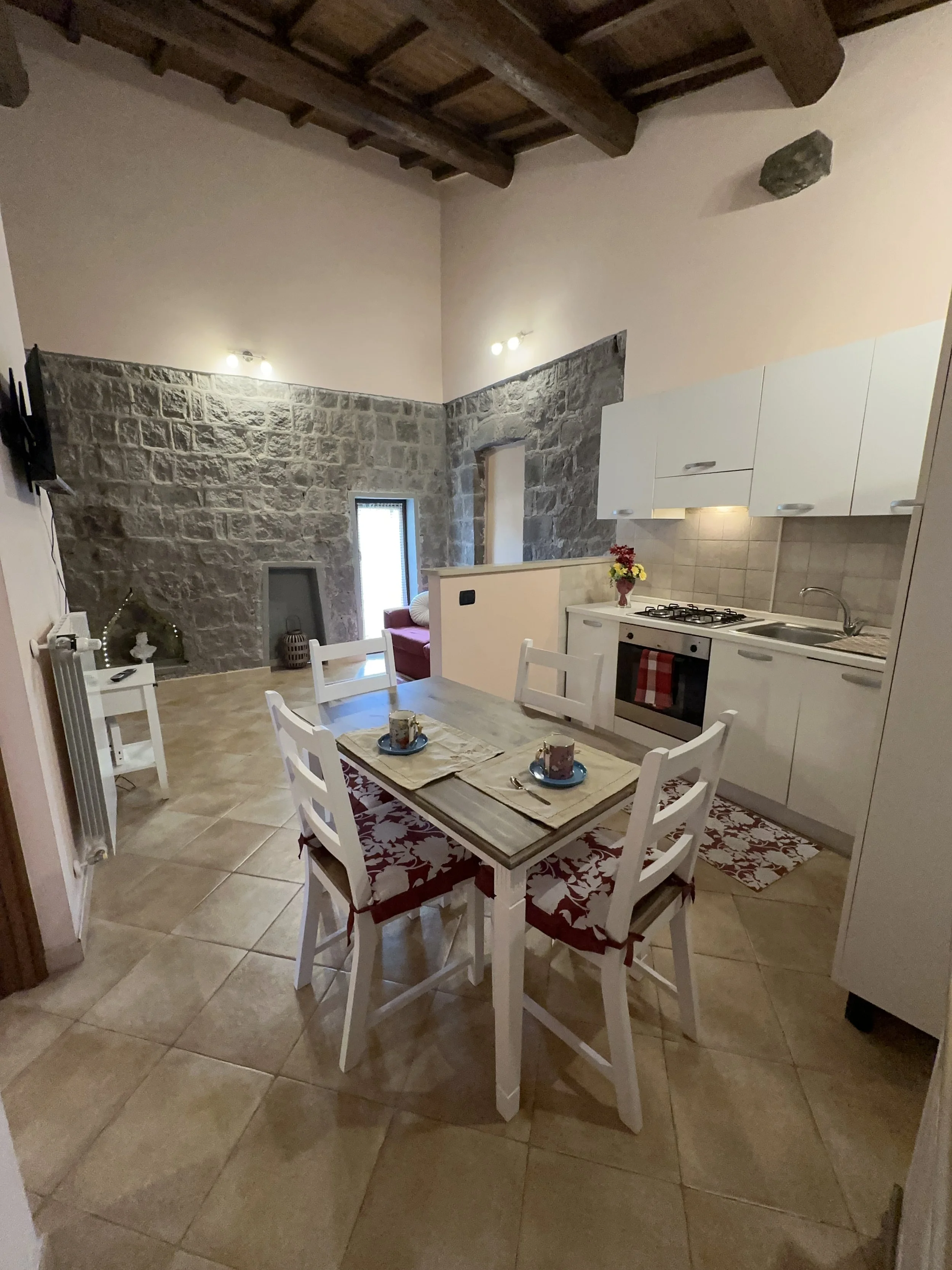 A cozy shabby-chic kitchen where tradition meets comfort. Natural wood details, a ceiling with exposed beams, and carefully curated light-toned furnishings create a warm and relaxing atmosphere. A perfect blend of rustic charm and modern style, ideal for enjoying a quiet breakfast or an intimate dinner in a space that feels like home and authenticity.