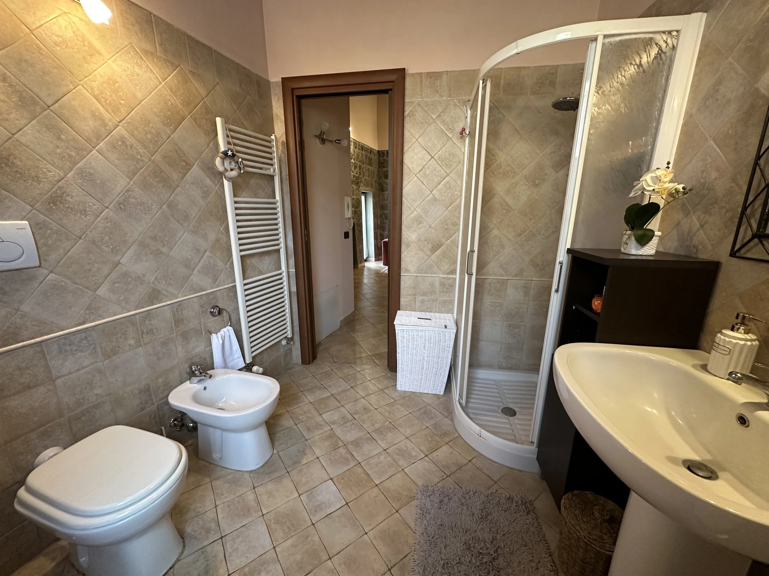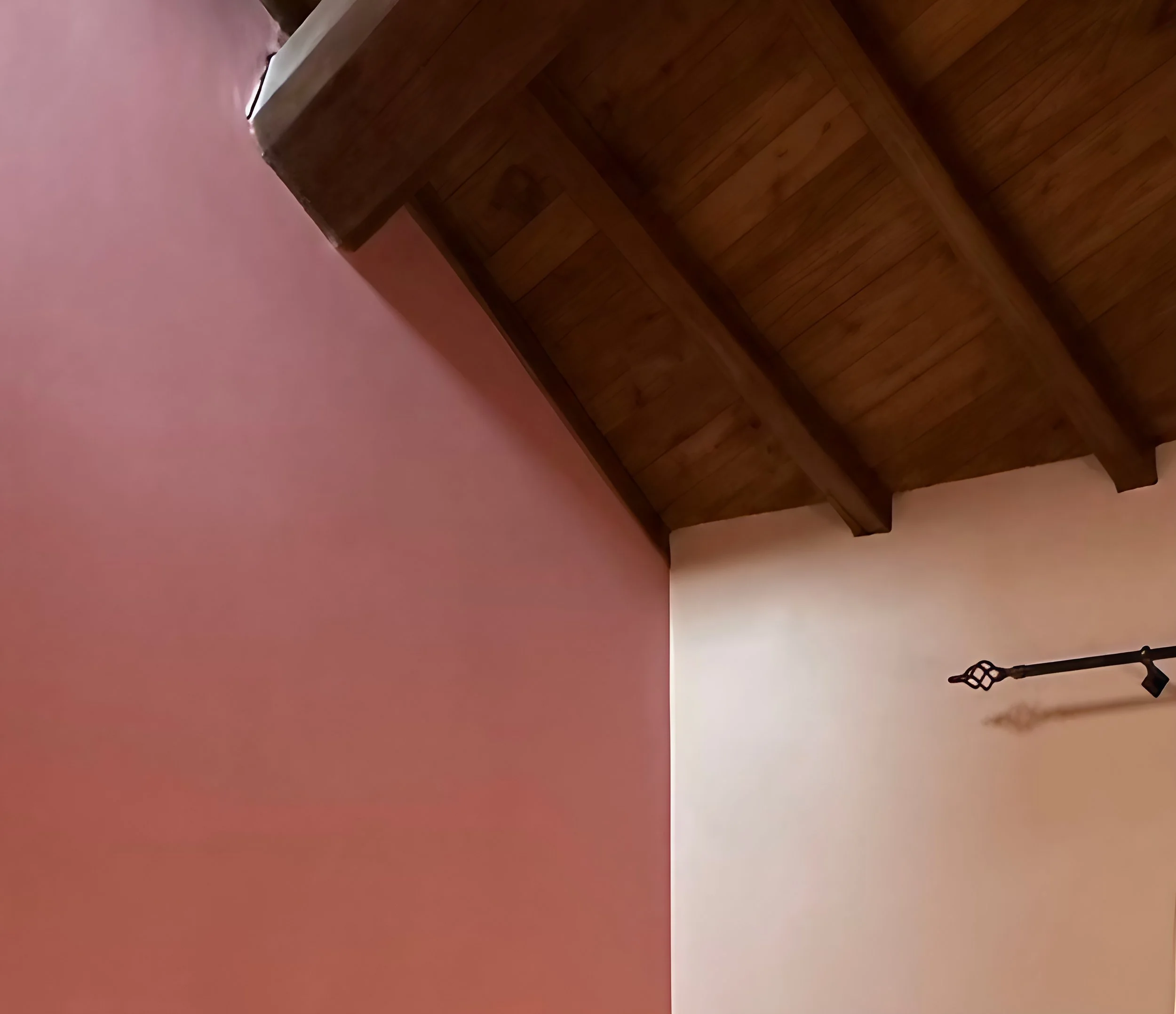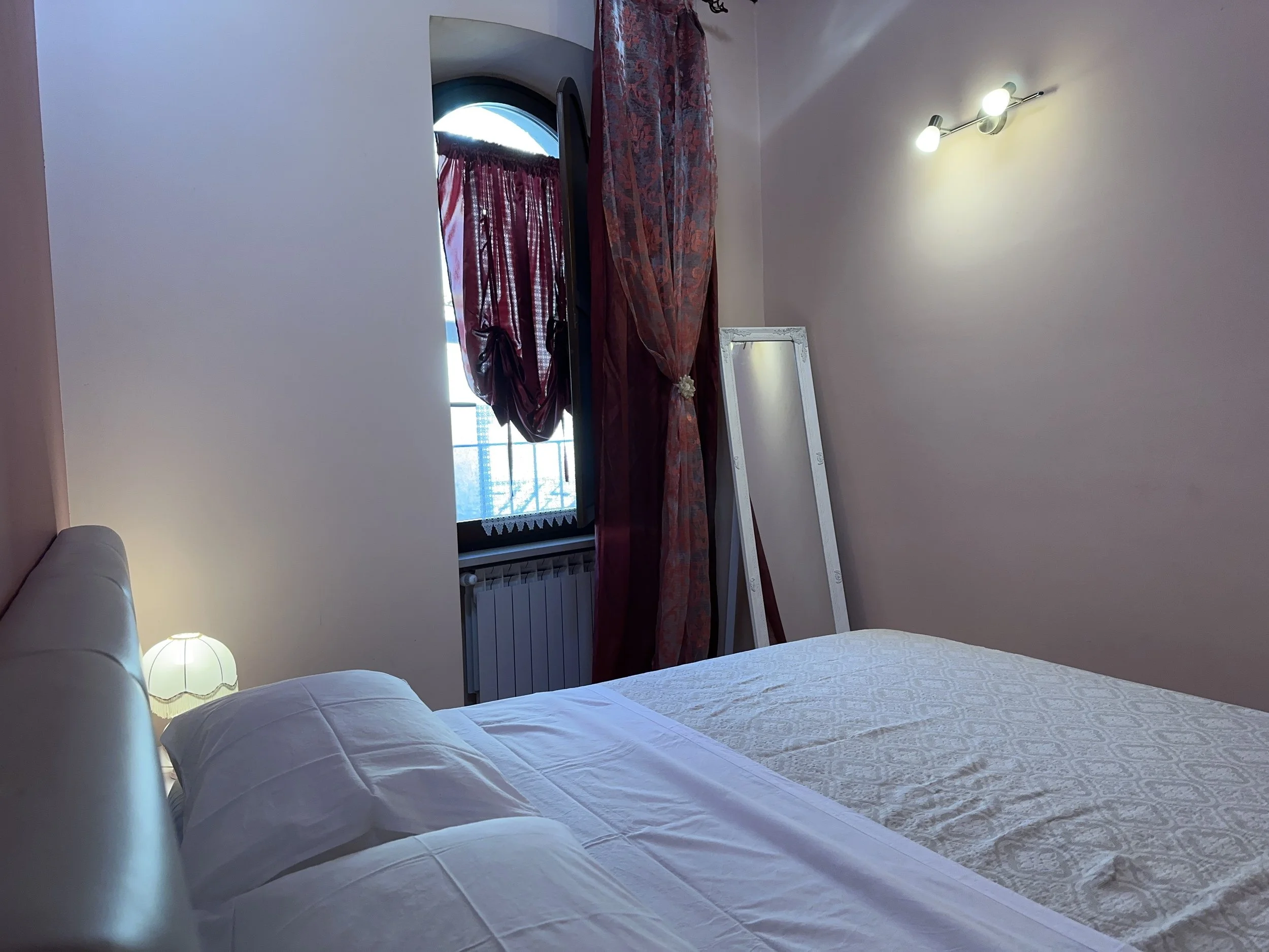 Let yourself be embraced by the warm and welcoming atmosphere of this room, where wooden ceilings, soft pink tones, and elegant details create the perfect setting for a relaxing and romantic stay. A comfortable double bed, soft lighting, and a touch of style: your perfect corner to unwind in the heart of our apartment