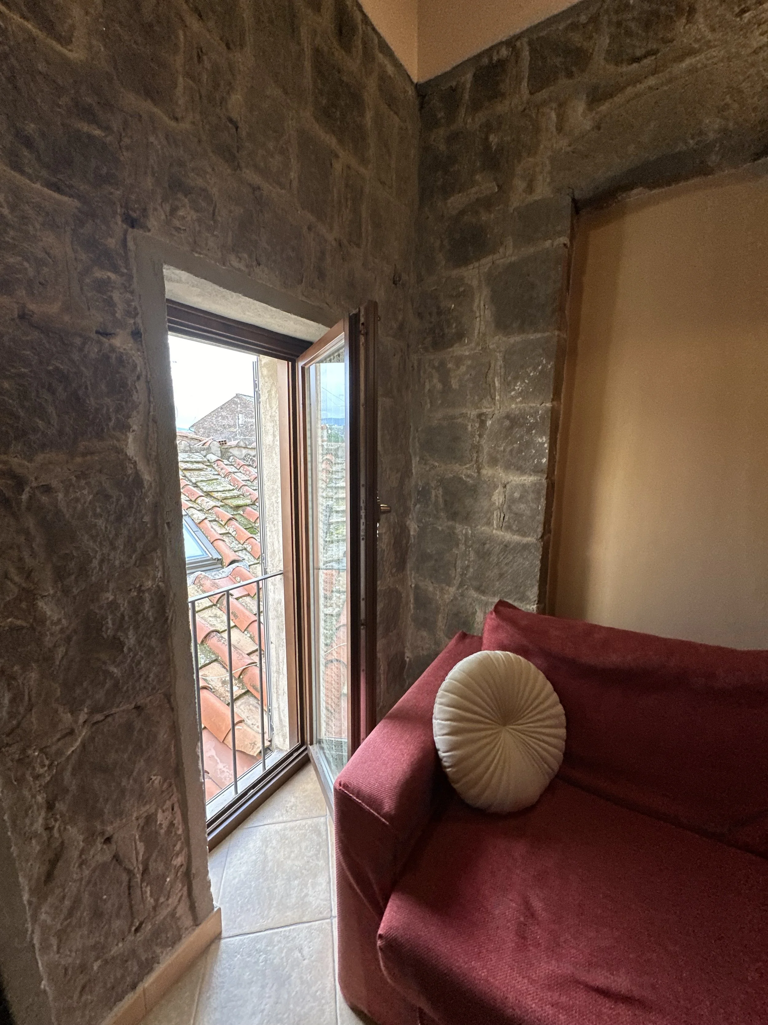 This cozy room celebrates the elegance of peperino, a local stone that tells centuries of tradition, paired with warm exposed wooden ceilings. The rustic atmosphere meets modern comfort, creating an ideal space to relax after a day exploring the local beauty.